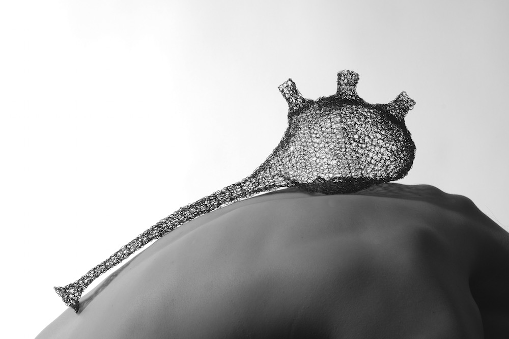 Fine dark-gray steel wires 0.2, 0.3, 0.4 and 0.7 mm are used just like how we use different numbers of graphite pencils to sketch on paper. I sketched through knitting process-without planning. When I started knitting I did not have the pictures of the finished pieces in mind. The pieces slowly and freely took their shapes, forms and stories during the knitting process. They seem familiar though not any recognized thing. Audience is stimulated to use their imagination to create story of the pieces base on their personal experience. Only then did I figure out how to transform them into jewellery.